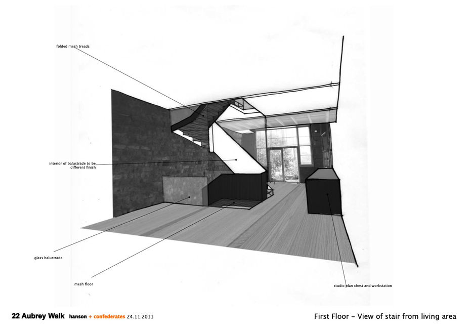 The complete remodelling of a nineteenth century house in Notting Hill; the addition of another floor and the formation of a basement under the property. The whole of the house has been redesigned to provide a studio and home with a spectacular new stair connecting all floors. A solid stair in the basement changes to a lightweight open timber stair from the ground floor to the second floor and finally to a glass stair up to the roof terrace thus ensuring the maximum light penetration into the deep plan.