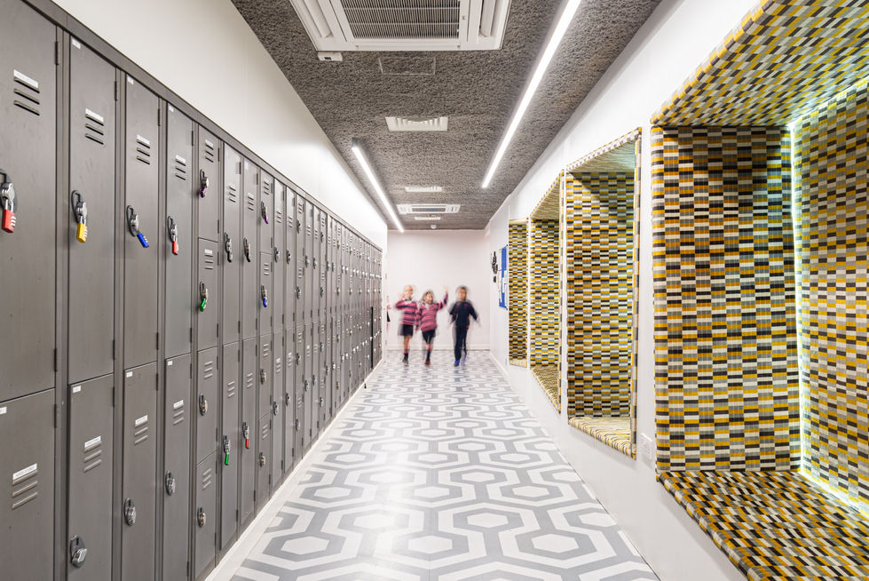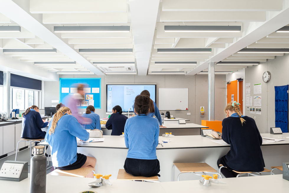 Phase 2 of our acoustically isolated building underneath the Westway Flyover involved the complete remodelling of the temporary gym in Bay 42 to include a new science block and two additional classrooms. It also gave us a chance to re-evaluate some of the previously completed elements and redesign them to suit the school’s changing needs. Metsec Beams loaded onto the existing columns below ensure that the structure remains tight to the underside of the motorway. Services are routed through the lattice beams at high level with the ceiling pushed upward in between. Acoustic baffles, lights and ventilation units are slotted into the maximised ceiling areas.